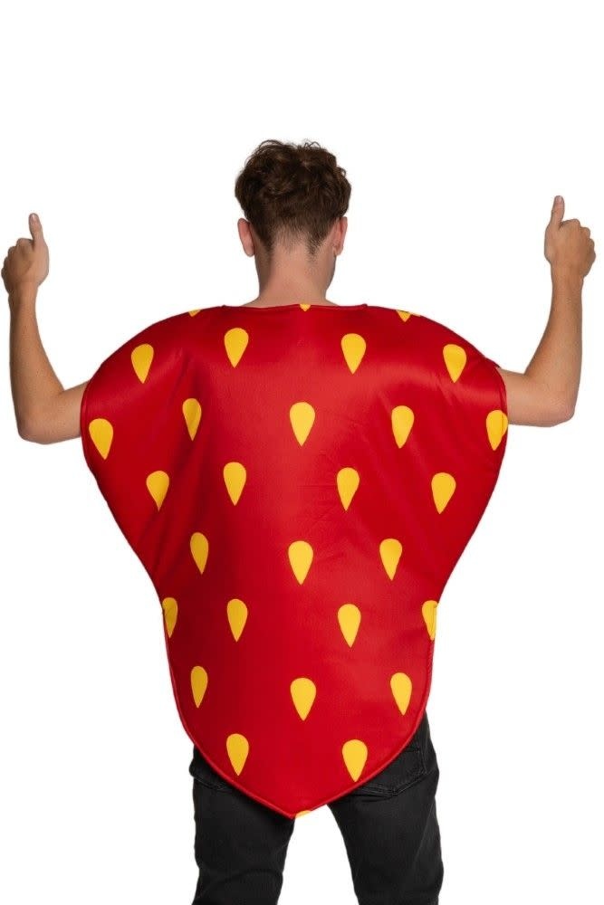 Dit aardbei verkleedkostuum combineert zichtbaarheid, comfort en eenvoud. Je trekt het snel aan over je eigen kleding en bent meteen klaar om te feesten. Het felle rood, de gele zaadjes en de groene kraag zorgen voor een herkenbare en vrolijke uitstraling.