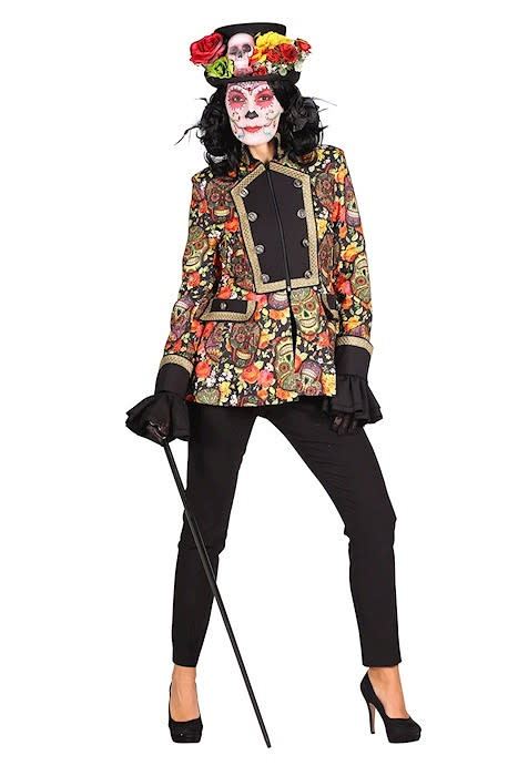 Deze prachtige dames Gravedigger jas is geïnspireerd op de kleurrijke tradities van Día de los Muertos. De zwarte jas is rijkelijk versierd met bloemen- en schedelprints, afgewerkt met gouden details en knopen voor een luxe uitstraling. Perfect te combineren met schmink, hoed of wandelstok (niet inbegrepen) voor een complete en indrukwekkende look. Ideaal voor Halloween, themafeesten en festivals