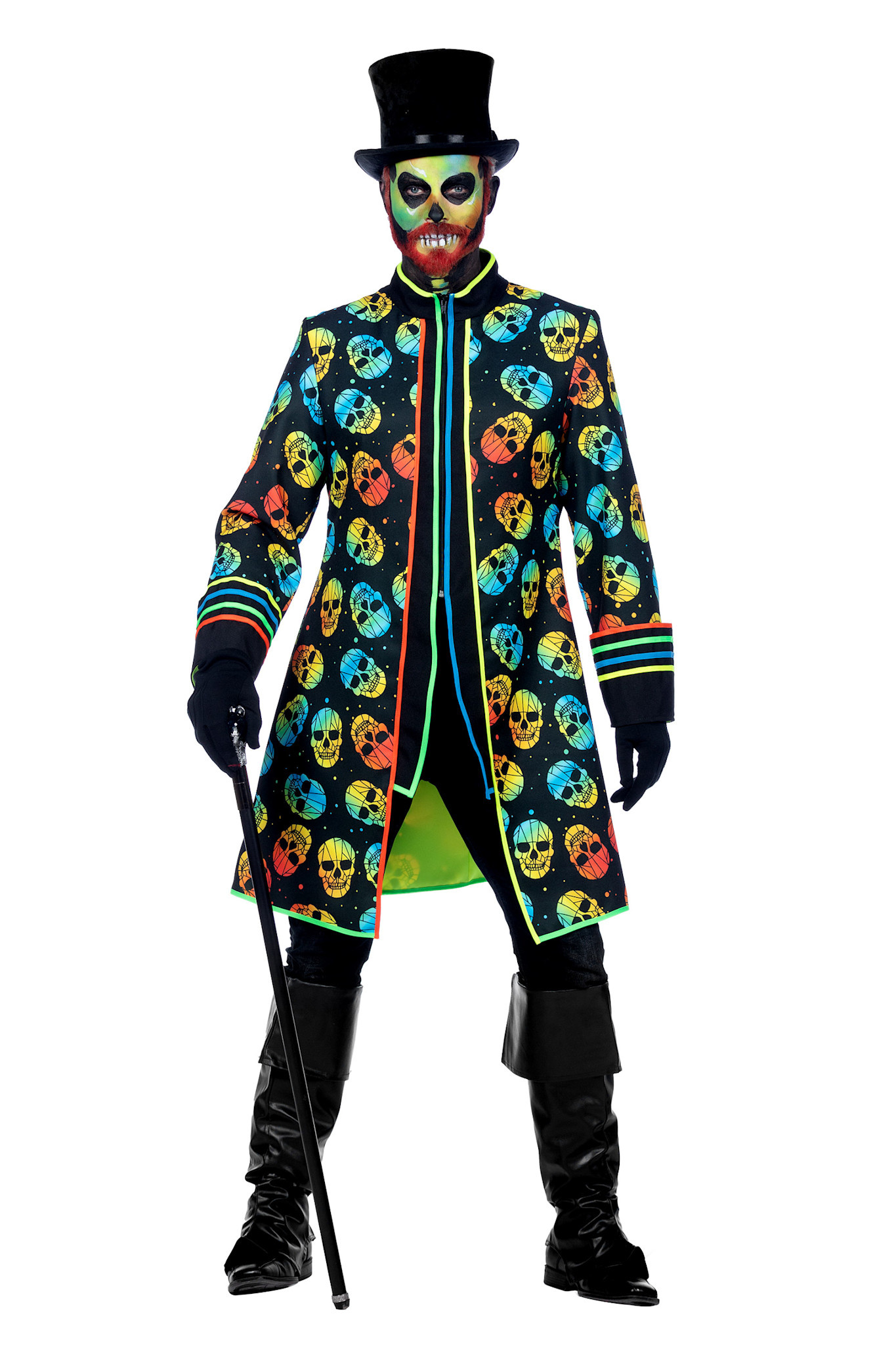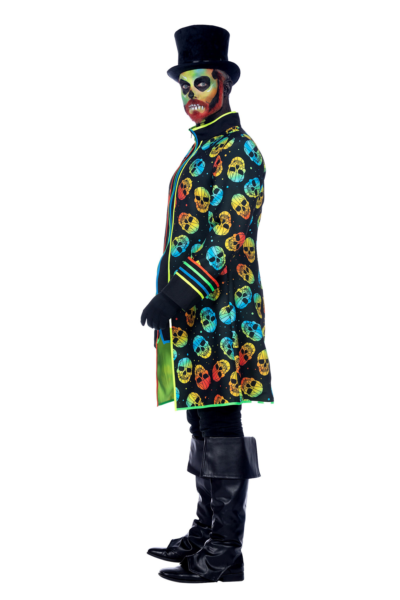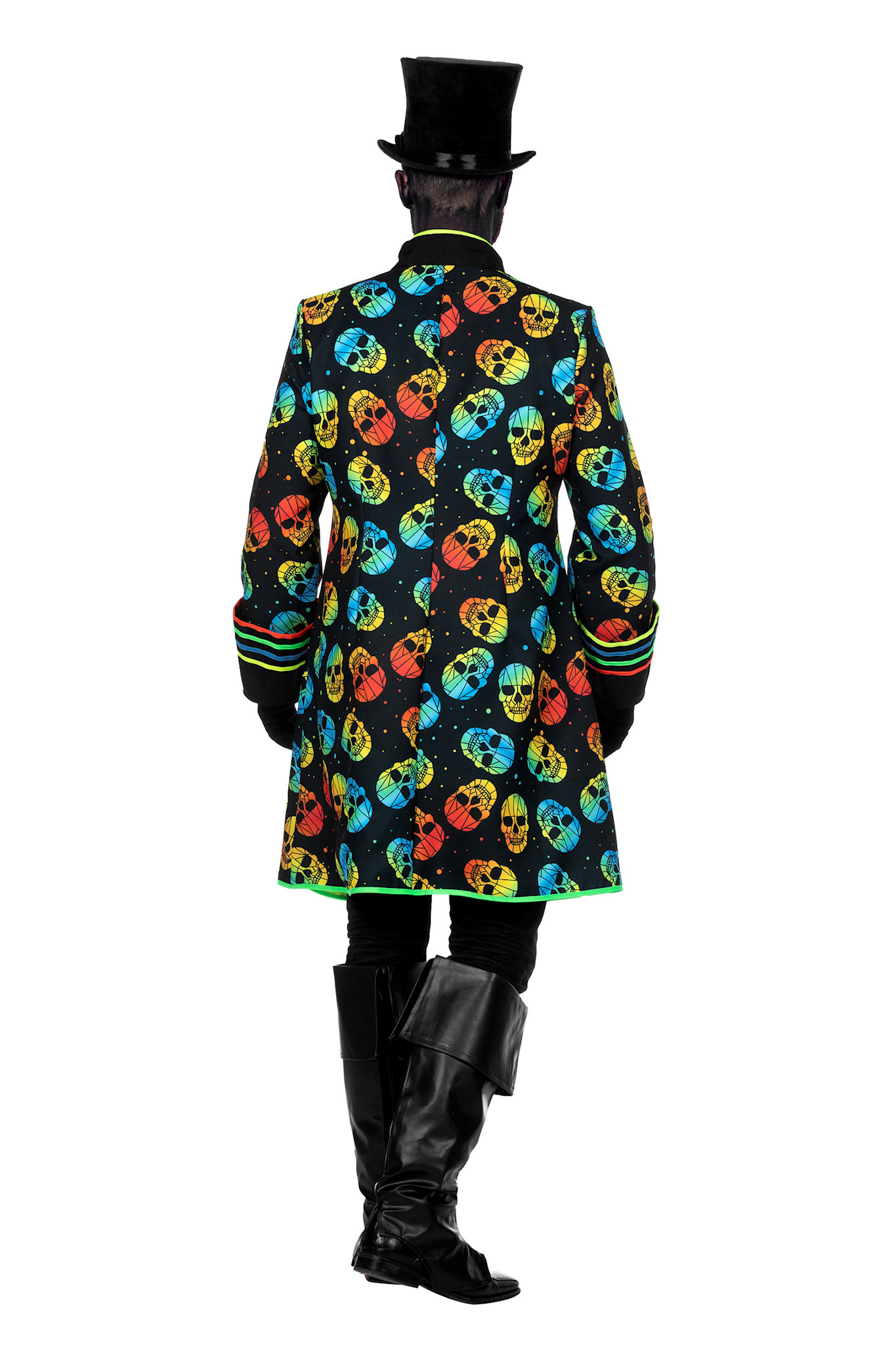 Deze opvallende lange jas met kleurrijke schedelprint is een echte blikvanger voor iedereen die durft te schitteren in het donker. De jas combineert een zwarte basis met felle neonkleuren die extra goed tot hun recht komen onder UV-licht – ideaal voor feestzalen of blacklight-thema’s.