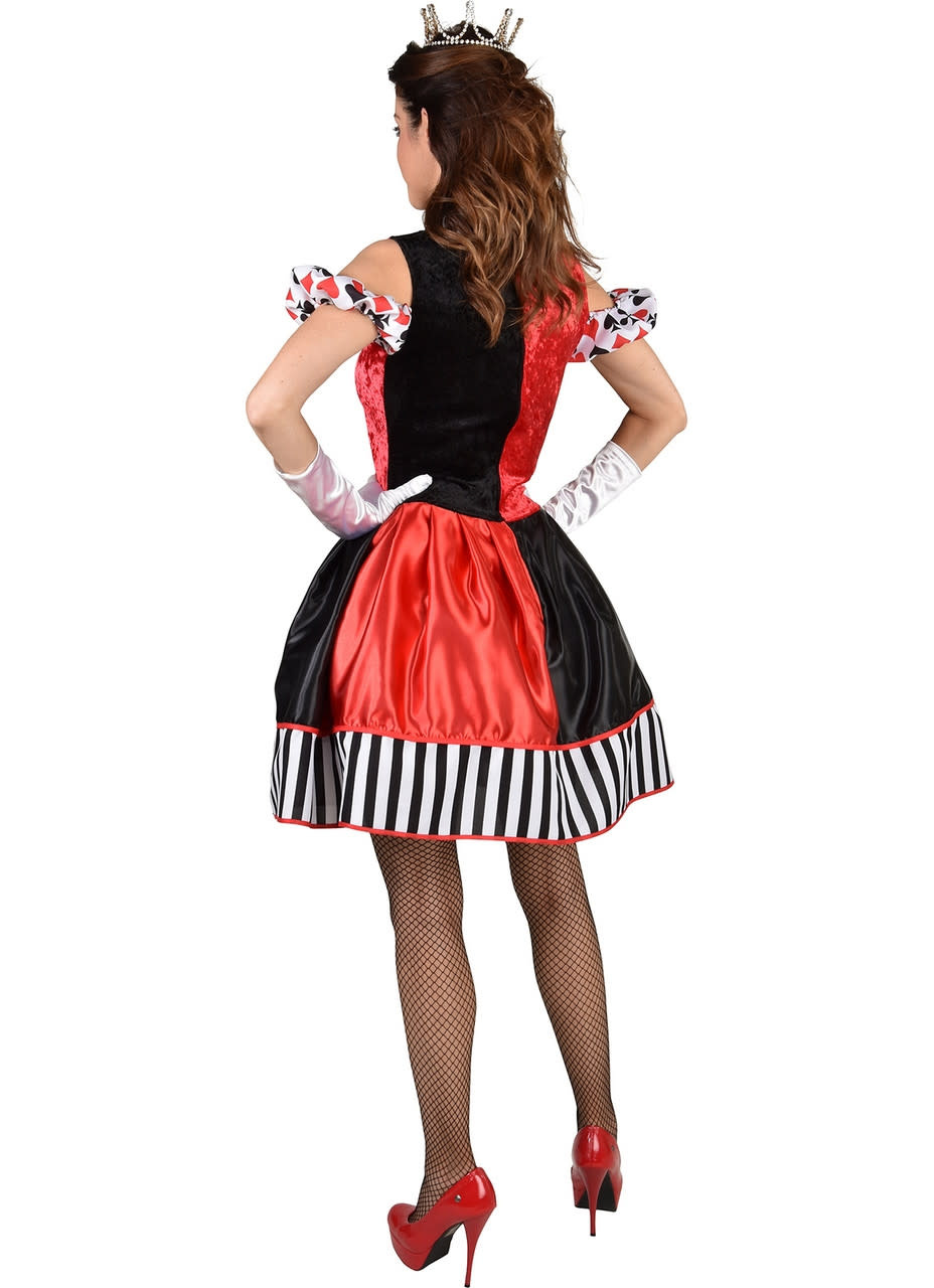Dit Queen Of Cards kostuum combineert rood zwart en wit met speelse kaartdetails voor een unieke look Het kleedje heeft een stijlvolle pasvorm en opvallende accenten die meteen de aandacht trekken Ideaal voor thema’s zoals fantasy sprookjes en kaartspellen