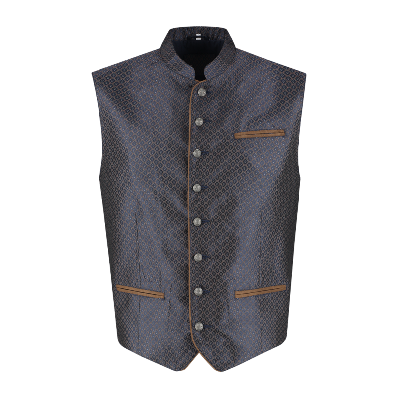 Geef je Oktoberfest outfit een elegante en traditionele uitstraling met deze trachtenweste in donkerblauw met bruine details. Dit stijlvolle heren gilet is voorzien van klassieke knopen en fijne patronen, waardoor het perfect te combineren is met een lederhose of traditionele broek.