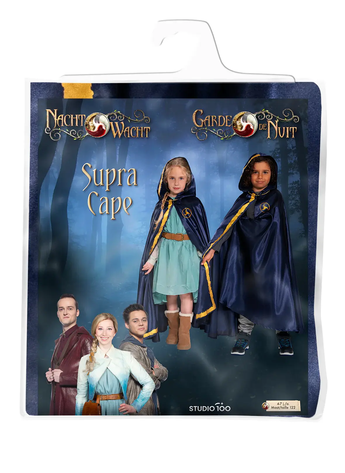De Studio 100 Nachtwacht verkleedkleding Supra-cape is een magische en stoere verkleedcape voor kinderen, geïnspireerd op de populaire serie Nachtwacht. Deze luxe cape is uitgevoerd in donkerblauw met gouden accenten en een herkenbaar embleem, waardoor kinderen zich direct een echte held voelen. De cape heeft een capuchon en is comfortabel te dragen, ideaal voor carnaval, verkleedfeestjes, Halloween of rollenspel. Perfect voor jonge fans die hun Nachtwacht kostuum willen uitbreiden of compleet maken.
