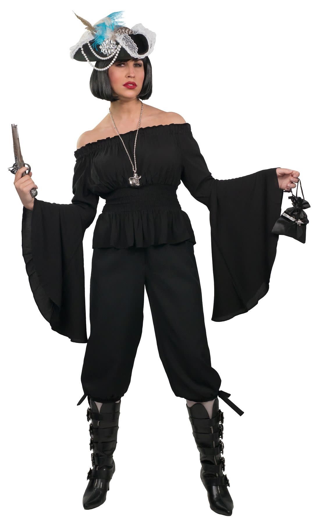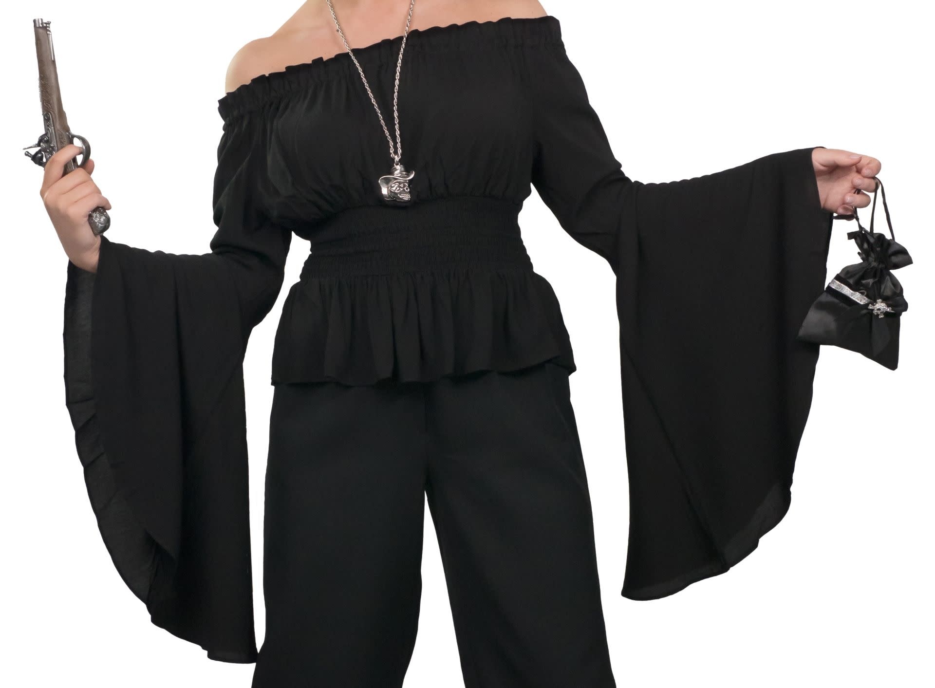 Deze elegante zwarte piraten blouse geeft jouw outfit meteen de uitstraling van een stoere zeerover of mysterieuze kapitein. De off-shoulder halslijn en wijduitlopende mouwen zorgen voor een authentiek, speels effect dat zowel bij mannen als vrouwen geweldig staat. Combineer de blouse met een piratenhoed, sabel of ooglapje en je hebt in een handomdraai een compleet piratenkostuum. Ideaal voor carnaval, themafeesten, theaterproducties of festivals met een avontuurlijk tintje