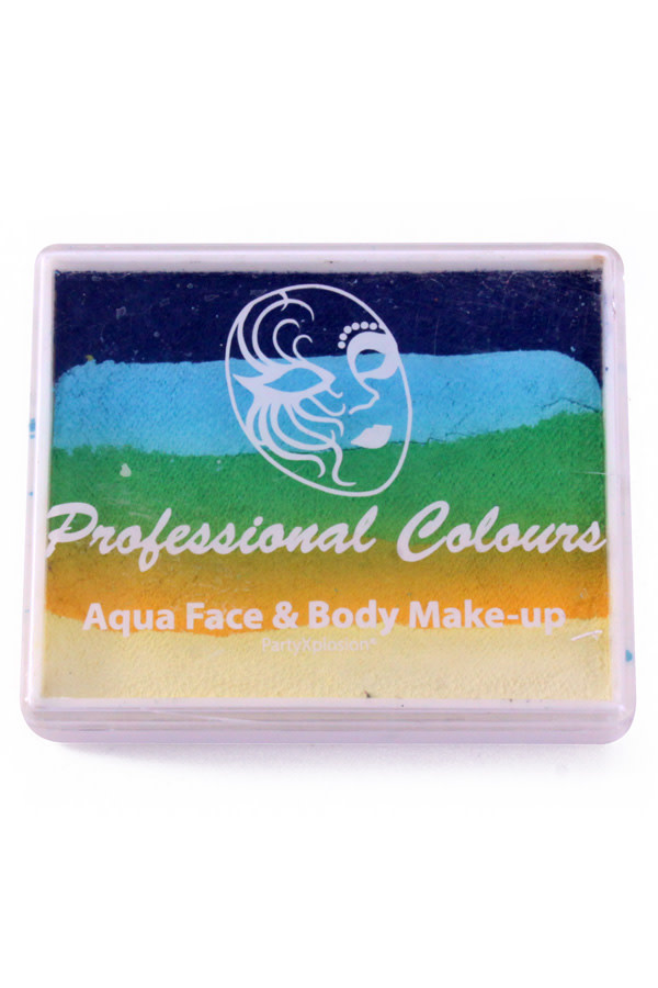 De PXP waterschminkSplitcake of rainbowcake bevat verschillende kleuren naast elkaar in een doosje. In de kleur d.blauw/l.blauw/l.groen/geel/wit. De verschillende kleuren kan je aanbrengen met penselen of een sponsje.