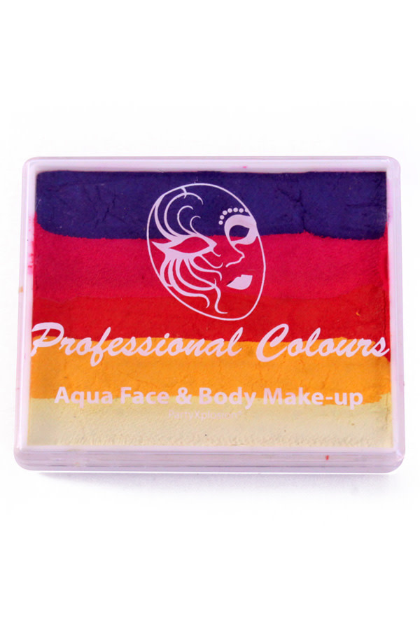De PXP waterschminkSplitcake of rainbowcake bevat verschillende kleuren naast elkaar in een doosje. In de kleur paars/koraal roze/oranje/geel/wit. De verschillende kleuren kan je aanbrengen met penselen of een sponsje.