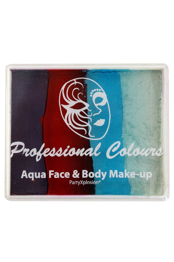 De PXP waterschminkSplitcake of rainbowcake bevat verschillende kleuren naast elkaar in een doosje. In de kleur paars/rood/l.blauw/wit. De verschillende kleuren kan je aanbrengen met penselen of een sponsje.