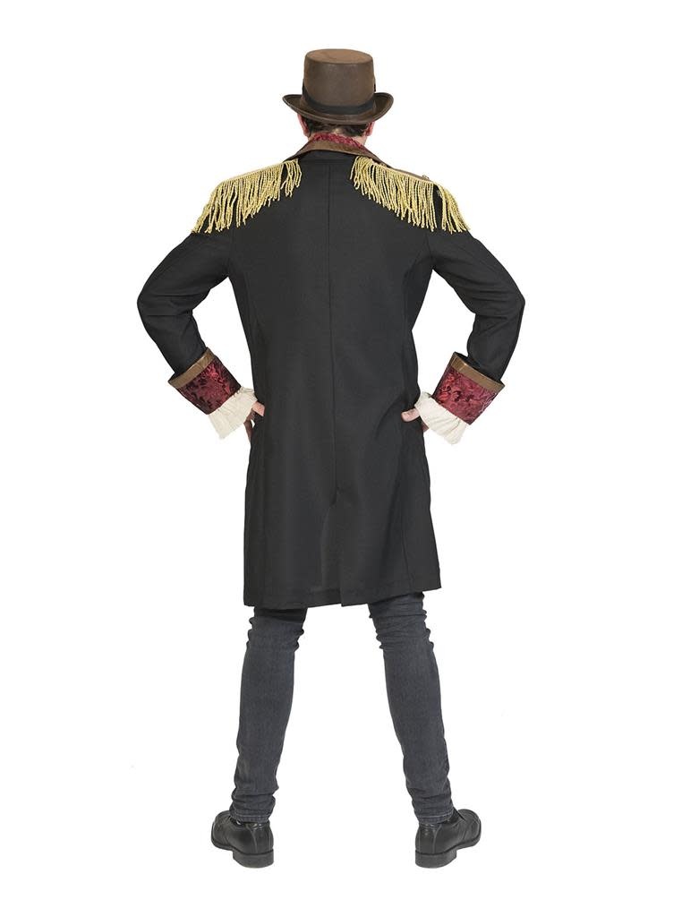 - Lange zwarte jas met gouden epauletten, brokaat details en tandwielborduursels