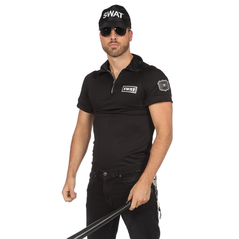 Het zwarte shirt is voorzien van een duidelijke SWAT-opdruk op de borst en rug, waardoor je outfit meteen geloofwaardig oogt. De aansluitende pasvorm en korte mouwen zorgen voor een krachtige, atletische look – ideaal voor wie indruk wil maken.
